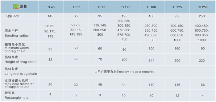 JS.106005 TL型鋼制拖鏈 Tl系列拖鏈的主體是由鏈板(優(yōu)質(zhì)鋼板鍍鉻)支撐板(擠拉鋁合金)軸銷(xiāo)(合金鋼)等部件組成,使電纜或橡膠管與拖鏈之間不產(chǎn)生相對(duì)運(yùn)動(dòng),不產(chǎn)生扭曲變形,鏈板經(jīng)鍍鉻處理外形效果新穎,結(jié)構(gòu)合理,靈巧強(qiáng)度高,鋼性好不變形,安裝方便,使用可靠,易拆裝,尤其是本產(chǎn)品采用了高強(qiáng)度耐磨材料,合金銅為軸銷(xiāo),提高了產(chǎn)品的耐磨強(qiáng)度,彎曲更靈活,阻力更小,降低了噪音,從而可保證長(zhǎng)時(shí)間使用不變形,不下垂。 由于本產(chǎn)品外觀精美,可在較大程度上增強(qiáng)機(jī)床設(shè)備的整體藝術(shù)美觀效果,增強(qiáng)我國(guó)機(jī)床、機(jī)械設(shè)備在市場(chǎng)的競(jìng)爭(zhēng)能力。 1.拖鏈可適應(yīng)移動(dòng)速度40米/分。 2.拖鏈在移動(dòng)速度時(shí),噪聲聲壓級(jí)不大于68分貝。 3.拖鏈安全使用壽命不小于100萬(wàn)次(往復(fù))。
