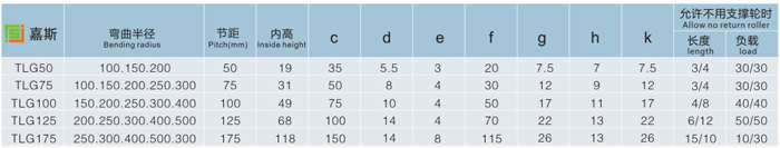 JS.106006 TLG型鋼制拖鏈 TLG型鋼制拖鏈可承載數(shù)量多,重量大的電纜及油管,自由懸置(允許不用支承輪)長度大,支撐板可依顧客需要制作,適用于工作母機,移動機械等。其彎曲半徑為50-600mm,鏈板高度為35-150mm,可任意使用。 TLG型鋼制拖鏈其使用行程較大為32米。適用于所有傳動方式?呻S意加長和縮短。此外,可通過改變銷軸獲得改變彎曲半徑。 拖鏈的支撐板寬度為150mm至600mm,孔與孔之間的間隔量為5mm。 鏈板的高度,也就是支撐板的高度,是由電纜較大直徑?jīng)Q定的,機床較大限度運轉(zhuǎn)時,如拖鏈的寬度超過300mm,拖鏈的長度超過4m時出于穩(wěn)定性原因,應(yīng)考慮選擇加大一號規(guī)格的拖鏈。 彎曲半徑要根據(jù)電纜的較大直徑選擇并應(yīng)達(dá)到電纜直徑的10倍。彎曲半徑可根據(jù)所給表格選擇50-600mm,行程小的可相應(yīng)選擇較小的半徑。 拖鏈的長=1/2行程+4個彎曲半徑,這只適用于當(dāng)固定聯(lián)結(jié)是在行程的中點時。 拖鏈的固定可根據(jù)機床的位置情況選擇。固定角鋼可放在外圍或內(nèi)周的拖鏈內(nèi)或外部,一般情況聯(lián)結(jié)部分在拖鏈內(nèi),而向外周。