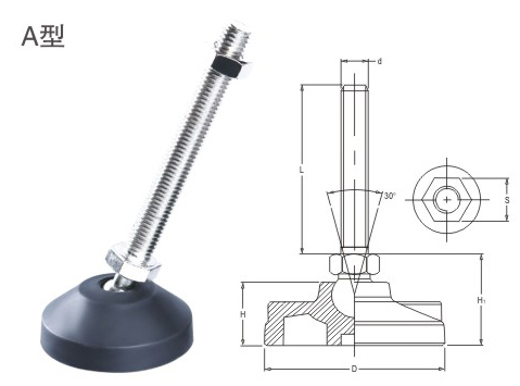 JS.108007 關(guān)節(jié)蹄腳 顏色:黑色 材質(zhì):增強(qiáng)尼龍、碳鋼 用途:適用于小型設(shè)備的水平調(diào)整及減震